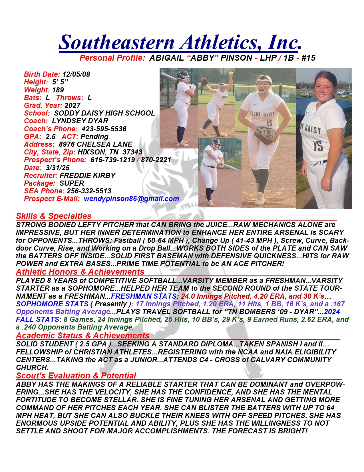 Abigail “Abby” Pinson, 2027, LHP / 1B, Soddy Daisy HS, TN