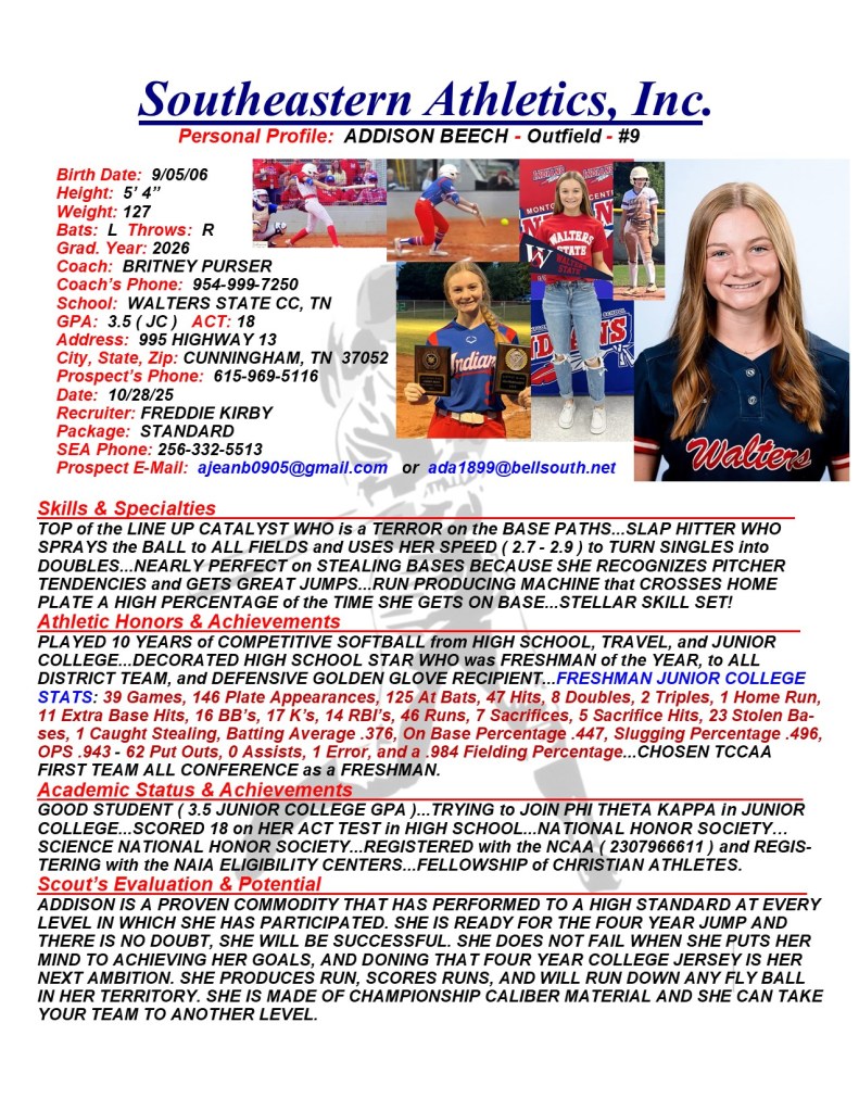 Addison Beech, 2026, Outfield, Walters State CC, TN