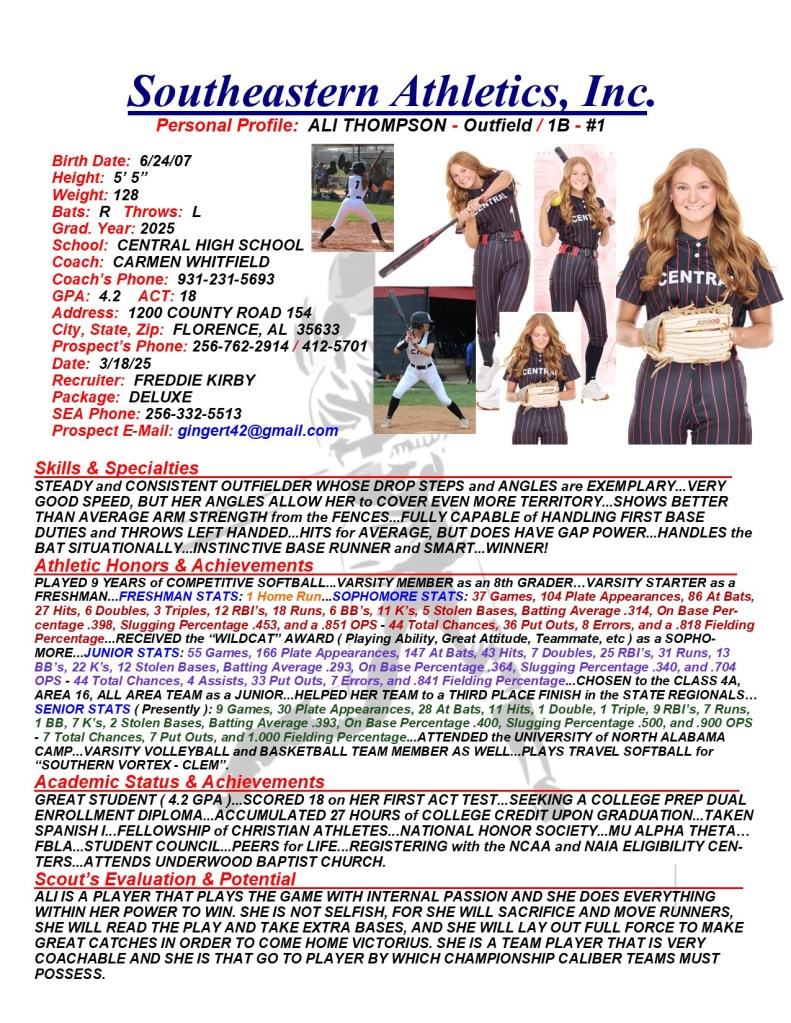 Ali Thompson, 2025, Outfield / 1B, Central Florence HS, AL