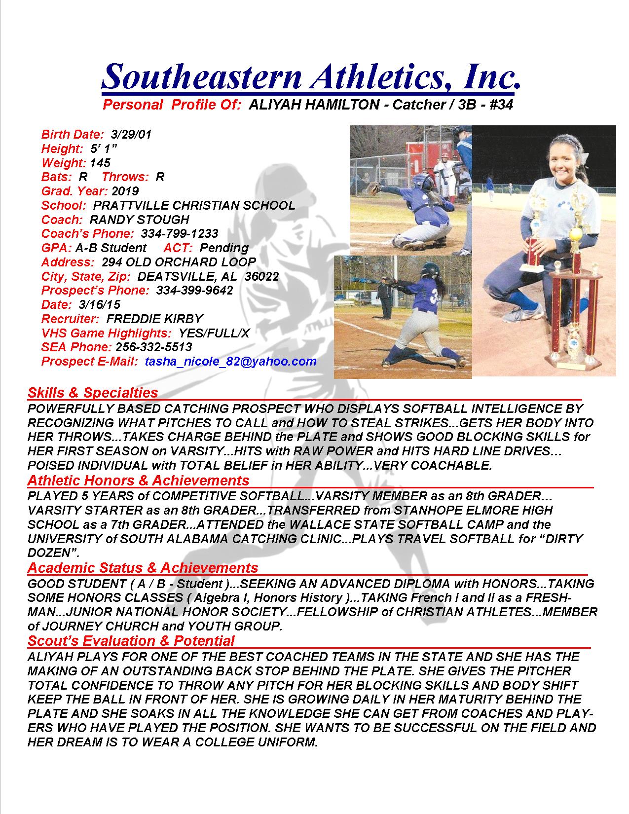 Aliyah Hamilton, 2019, Catcher, Prattville Christian Academy, AL