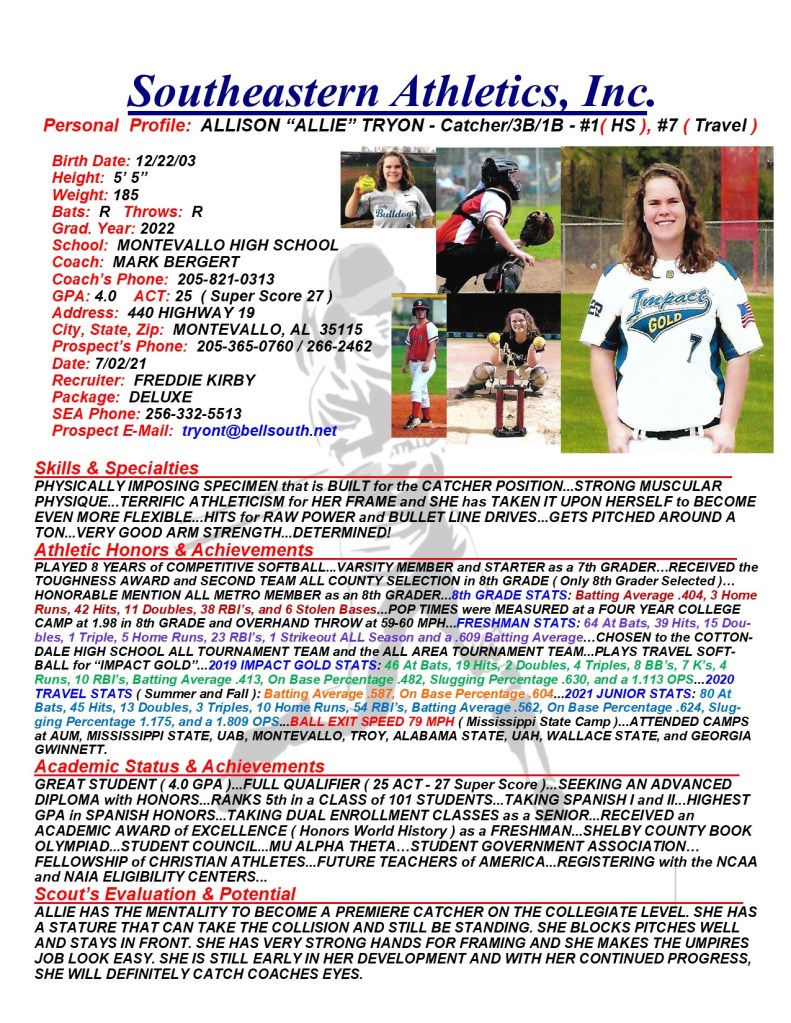Allison “Allie” Tryon, 2022, Catcher / 3B / 1B, Montevallo HS, AL