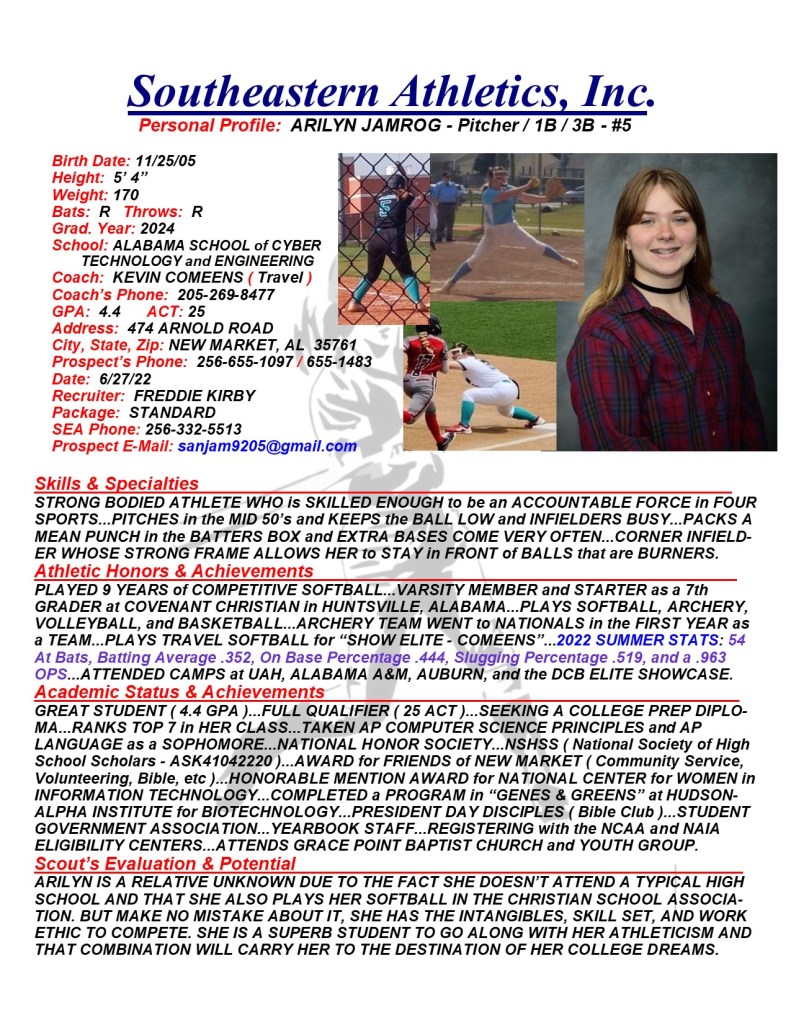 Arilyn Jamrog, 2024, Pitcher / 1B / 3B, Alabama School of Cyber Technology and Engineering