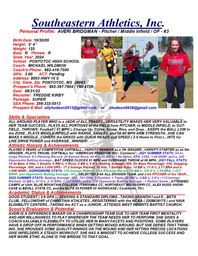Averi Bridgman, 2024, Pitcher / Middle Infield / OF, Pontotoc HS, MS