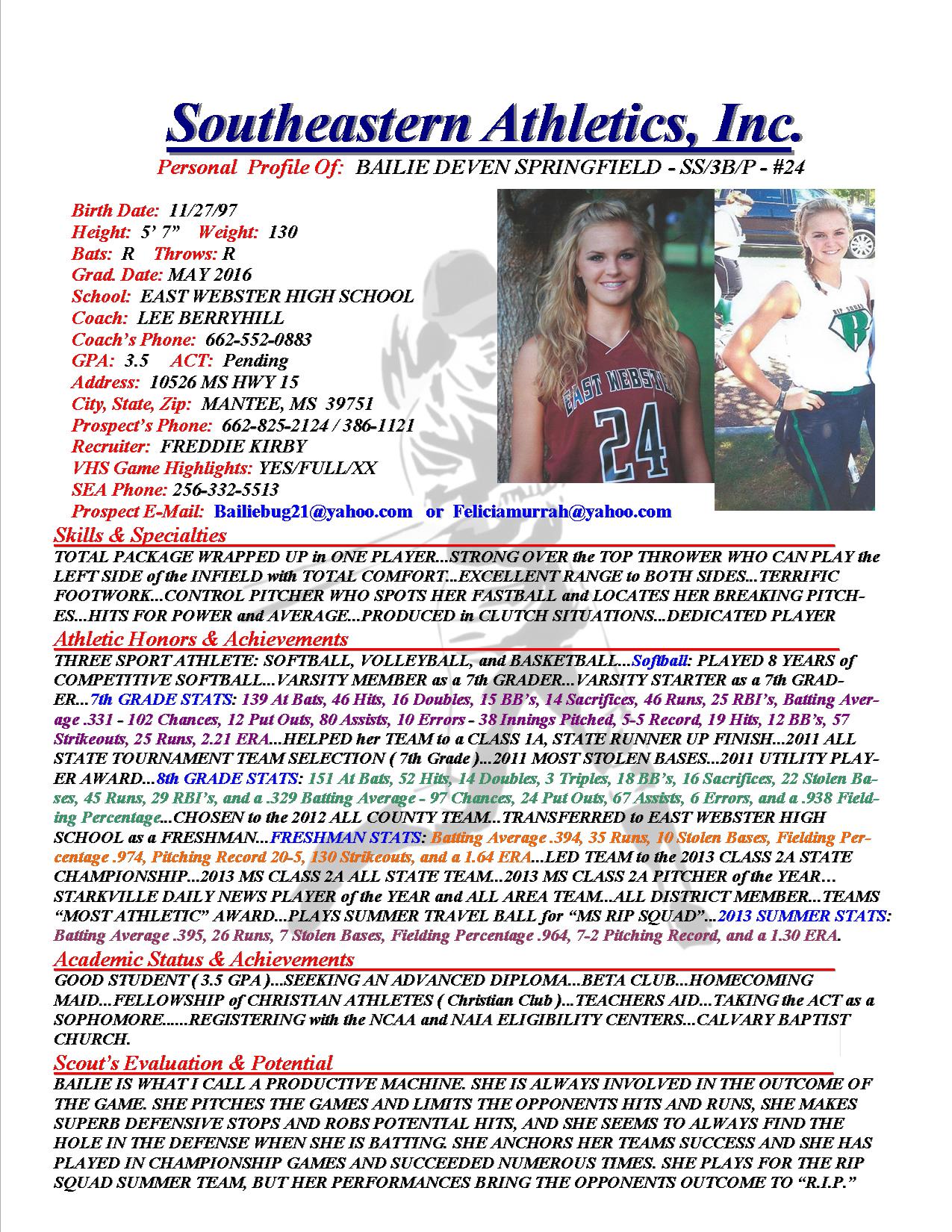 Bailie Springfield, 2016, SS/3B/P, East Webster HS, Columbus MS