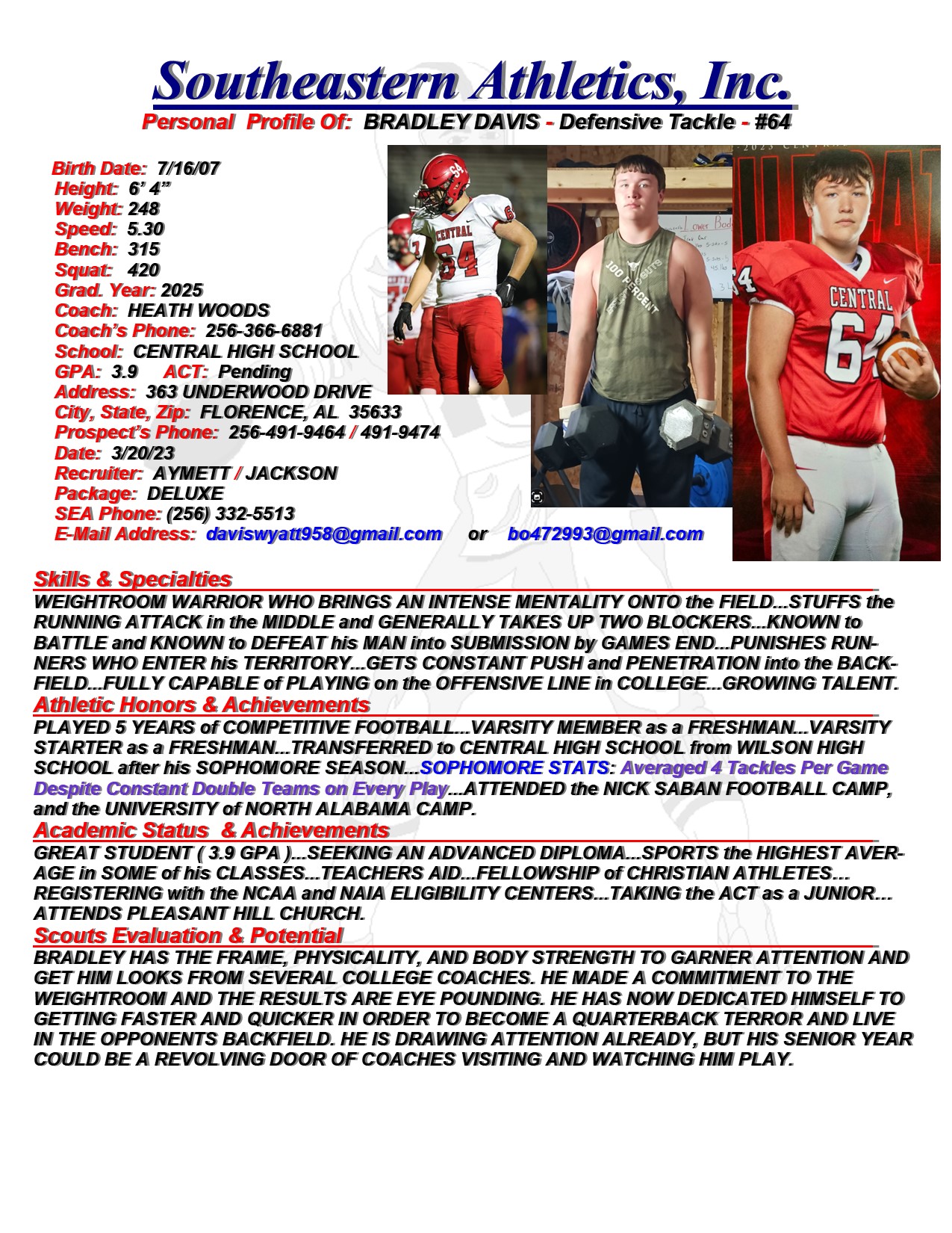 Bradley Davis, 2025, Defensive Tackle, Central HS, Florence, AL
