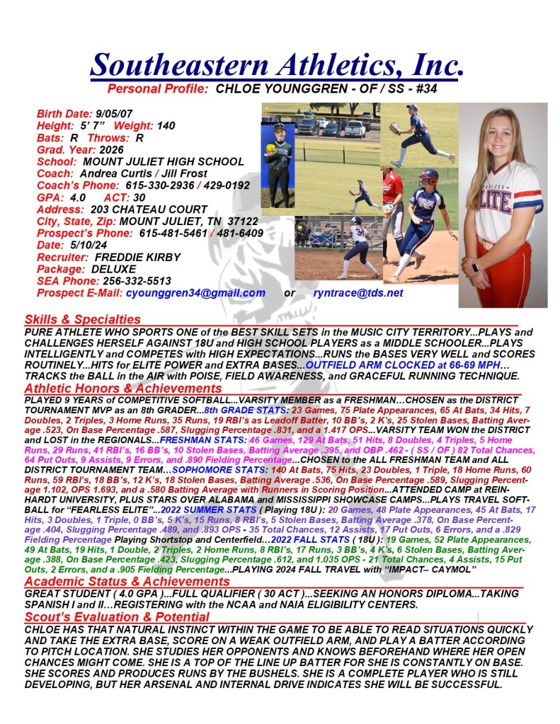 Chloe Younggren, 2026, Centerfield / Shortstop, Mount Juliet HS, TN