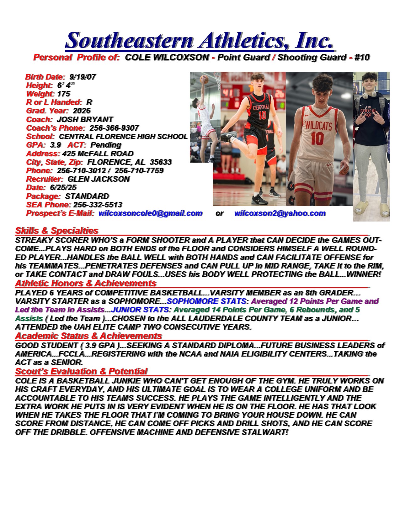 Cole Wilcoxson, 2026, Point Guard / Shooting Guard, Central Florence HS, AL