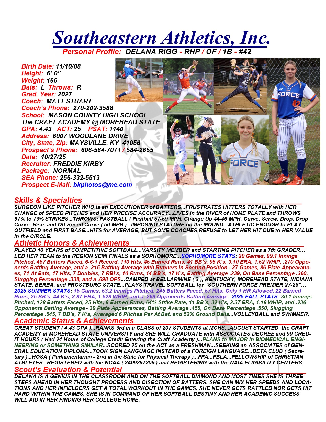 Delana Rigg, 2027, Pitcher / OF / 1B, Mason County HS, KY – The Craft Academy, Morehead State University