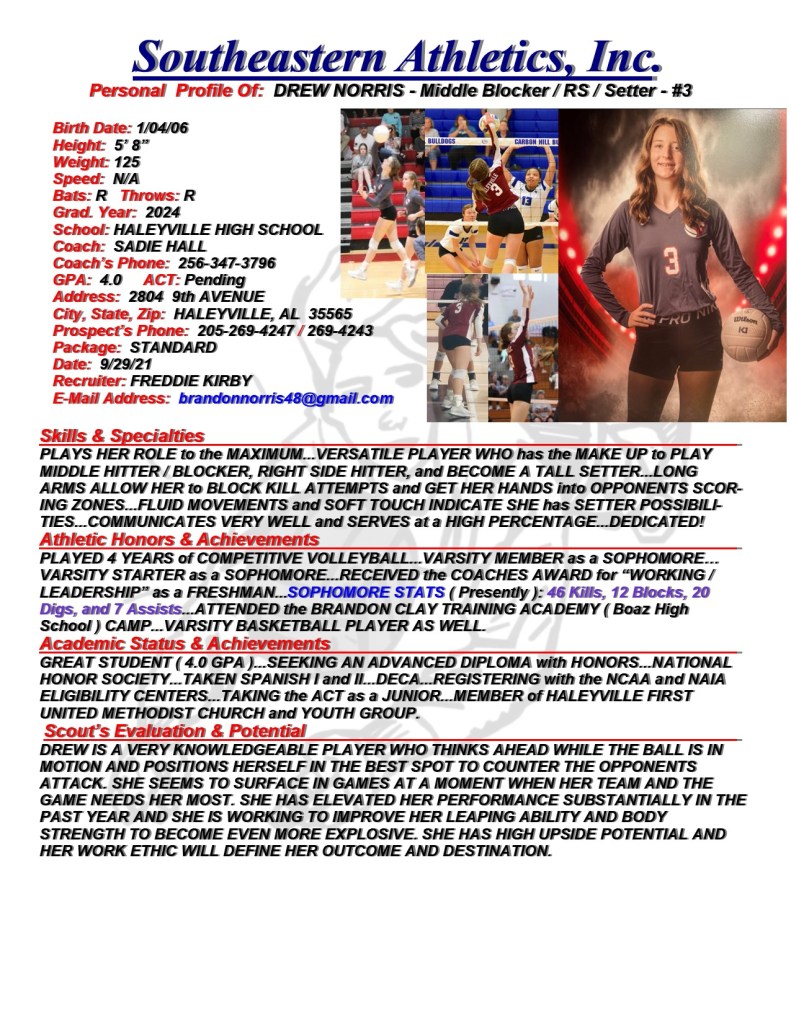 Drew Norris, 2024, Middle Blocker / RS / Setter, Haleyville HS, AL
