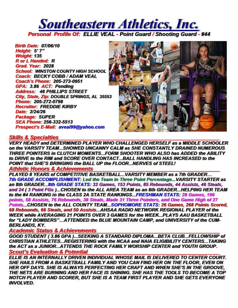 Ellie Veal, 2028, Point Guard / Shooting Guard, Winston County HS, AL