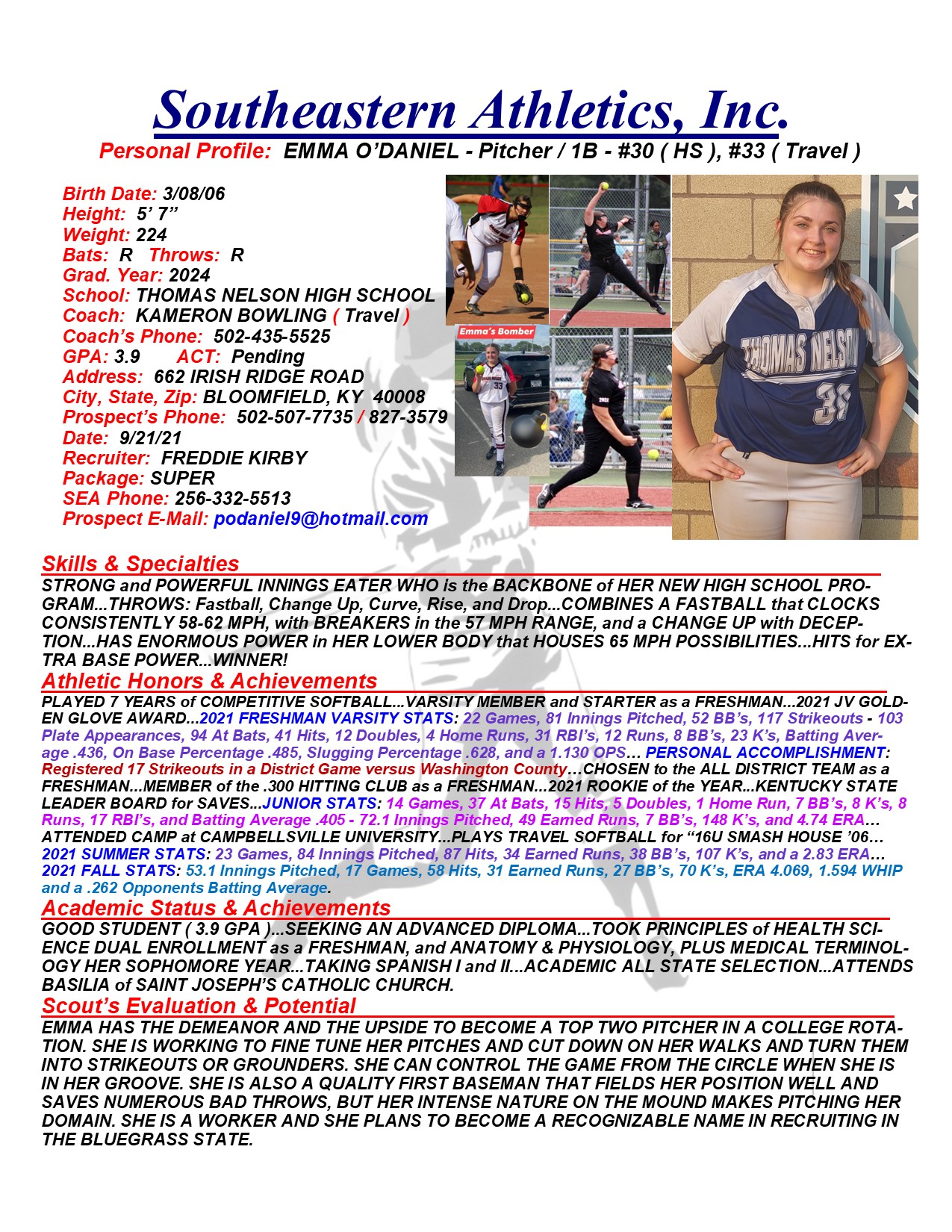 Emma O’Daniel, 2024, Pitcher / 1B, Thomas Nelson HS, KY