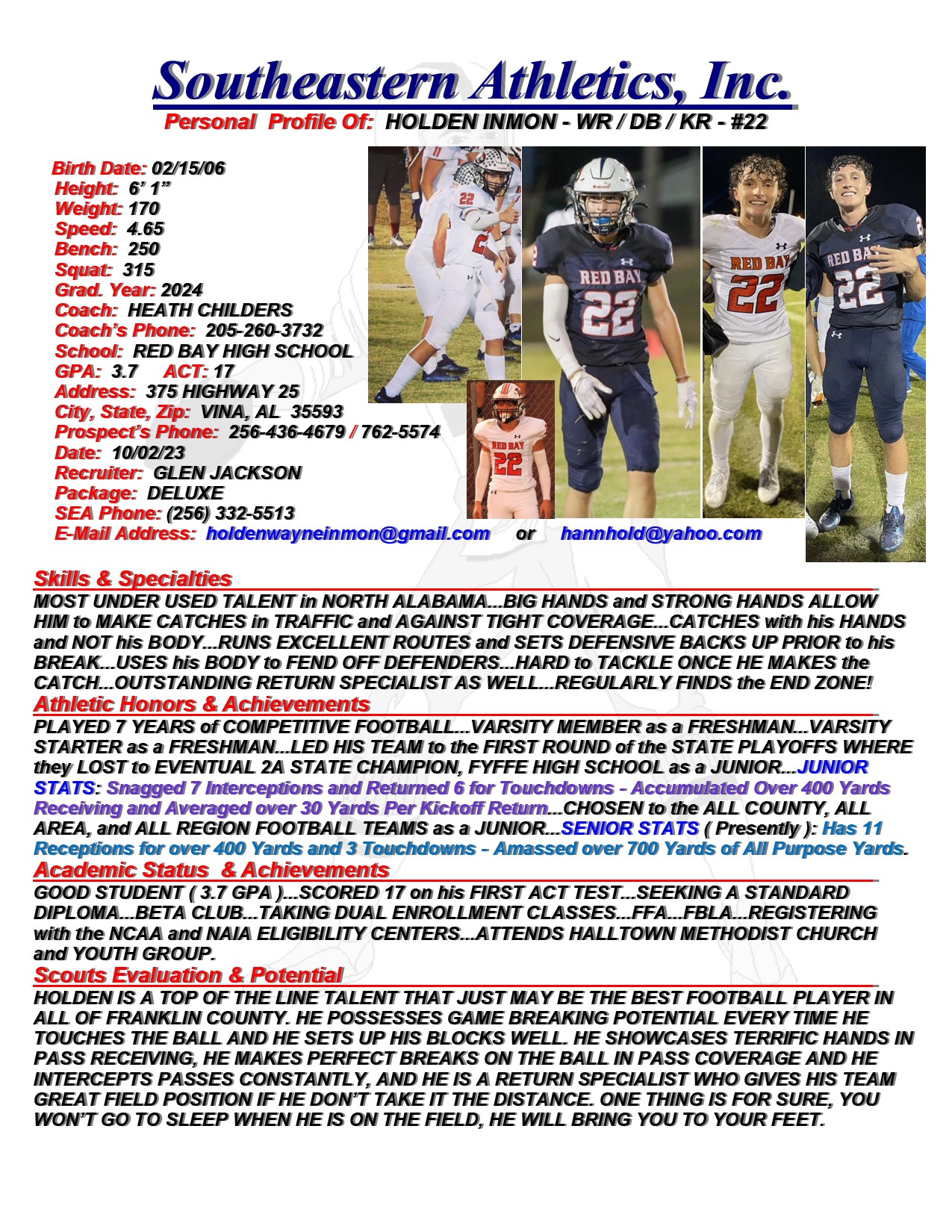 Holden Inmon, 2024, WR / DB / KR, Red Bay HS, AL