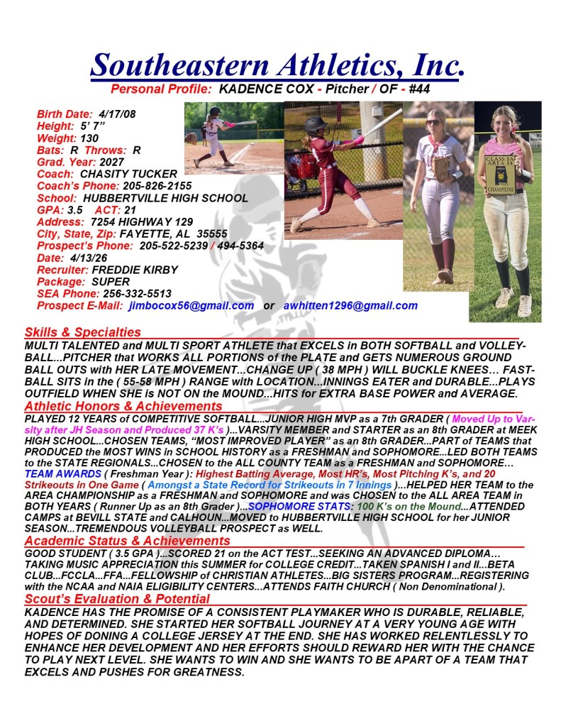 Kadence Cox, 2027, Pitcher / OF, Hubbertville HS, AL