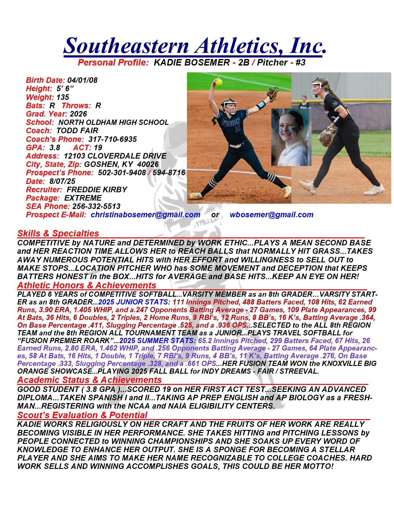 Kadie Bosemer, 2026, 2B / Pitcher, North Oldham High School, KY