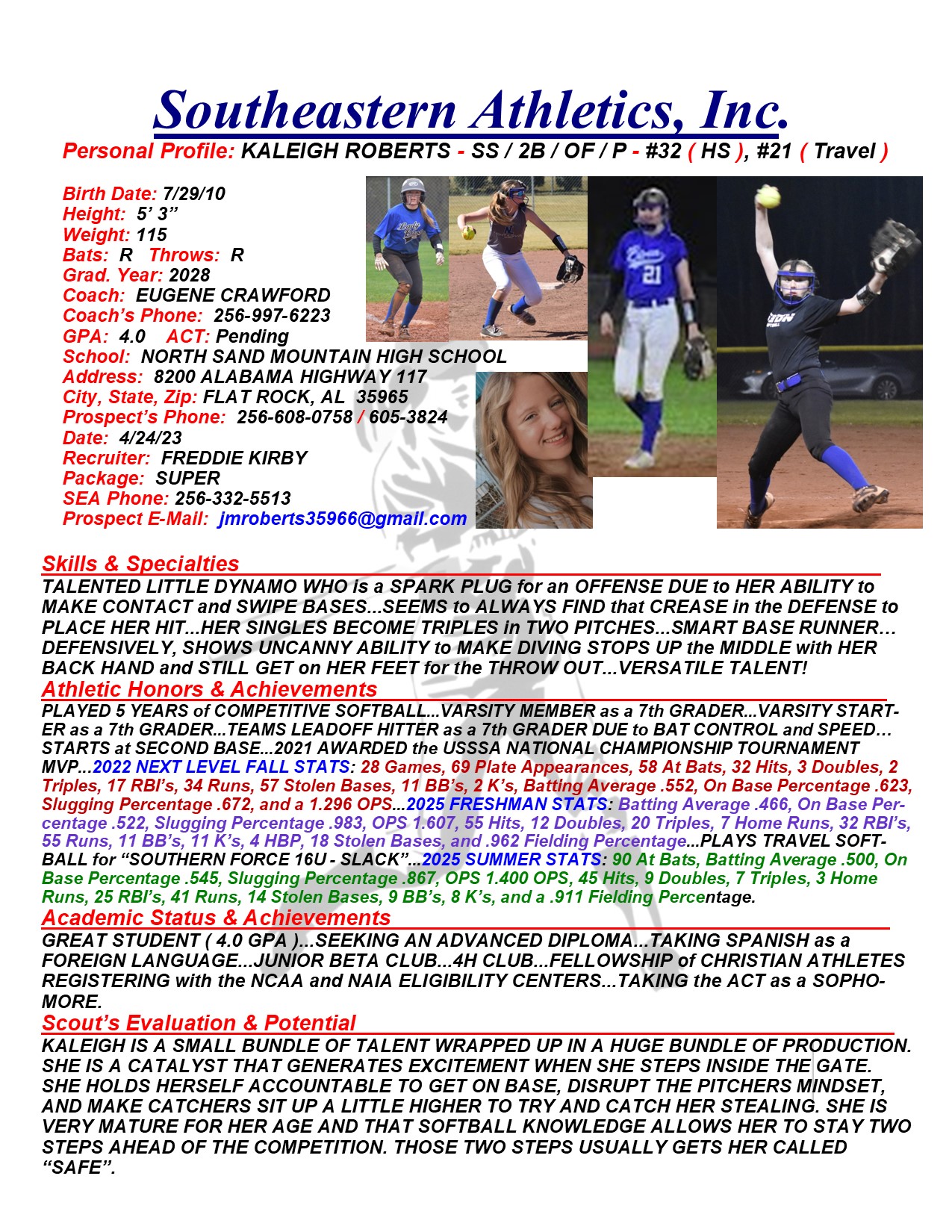 Kaleigh Roberts, 2028, SS / 2B / OF / P, North Sand Mountain, AL