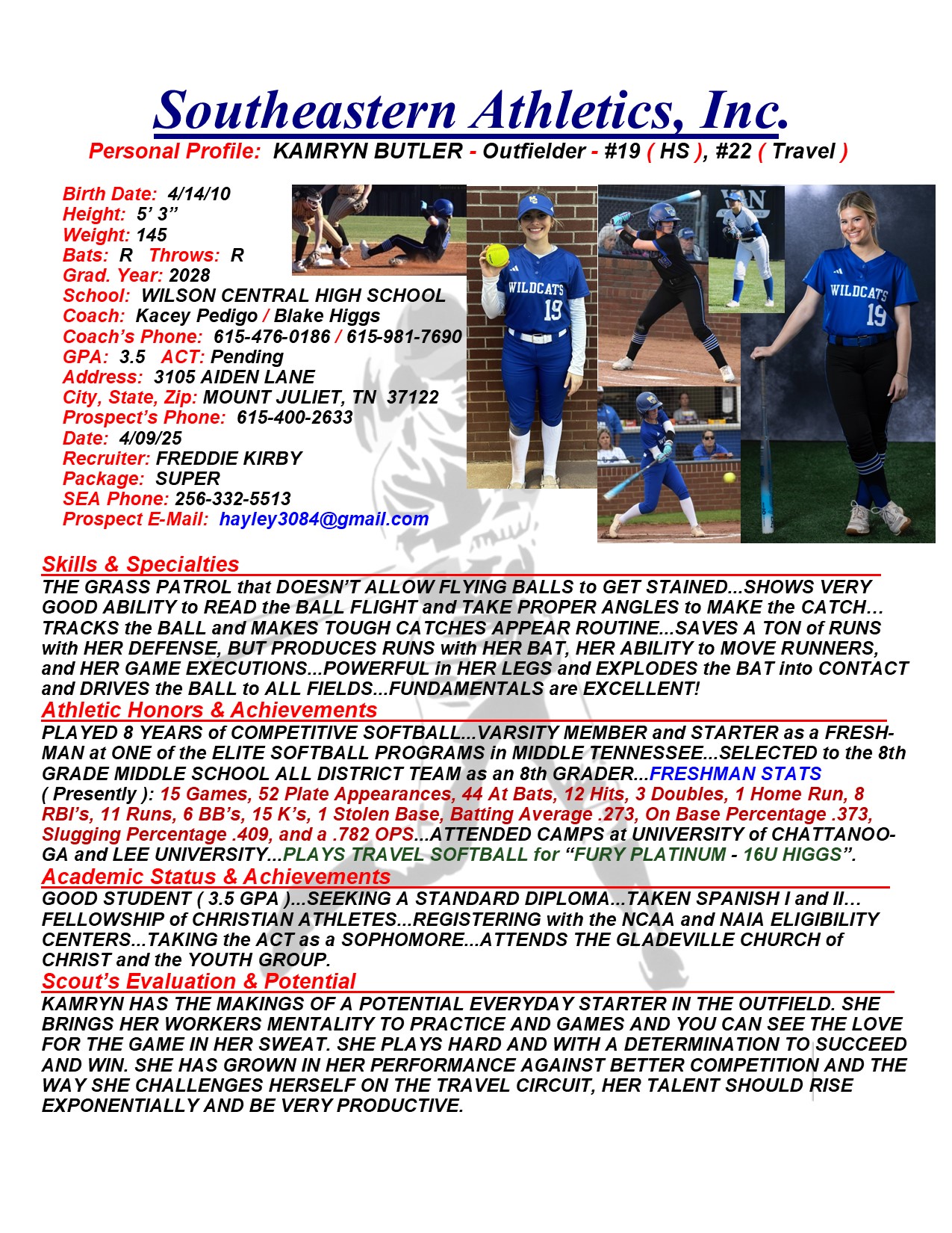 Kamryn Butler, 2028, Outfield, Wilson Central HS, TN