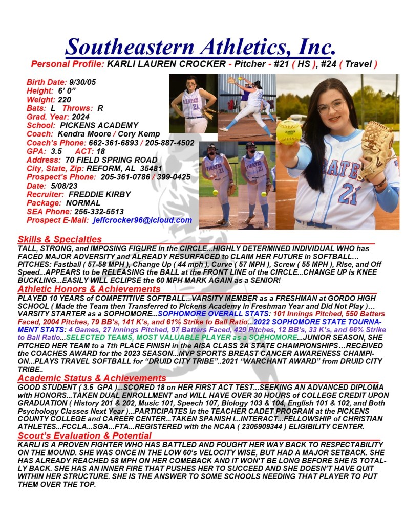 Karli Crocker, 2024, Pitcher, Pickens Academy, AL
