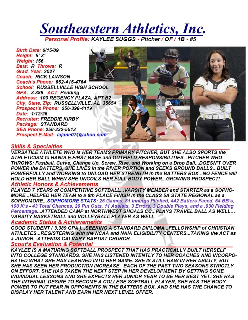 Kaylee Suggs, 2027, Pitcher / 1B / OF, Russellville HS, AL