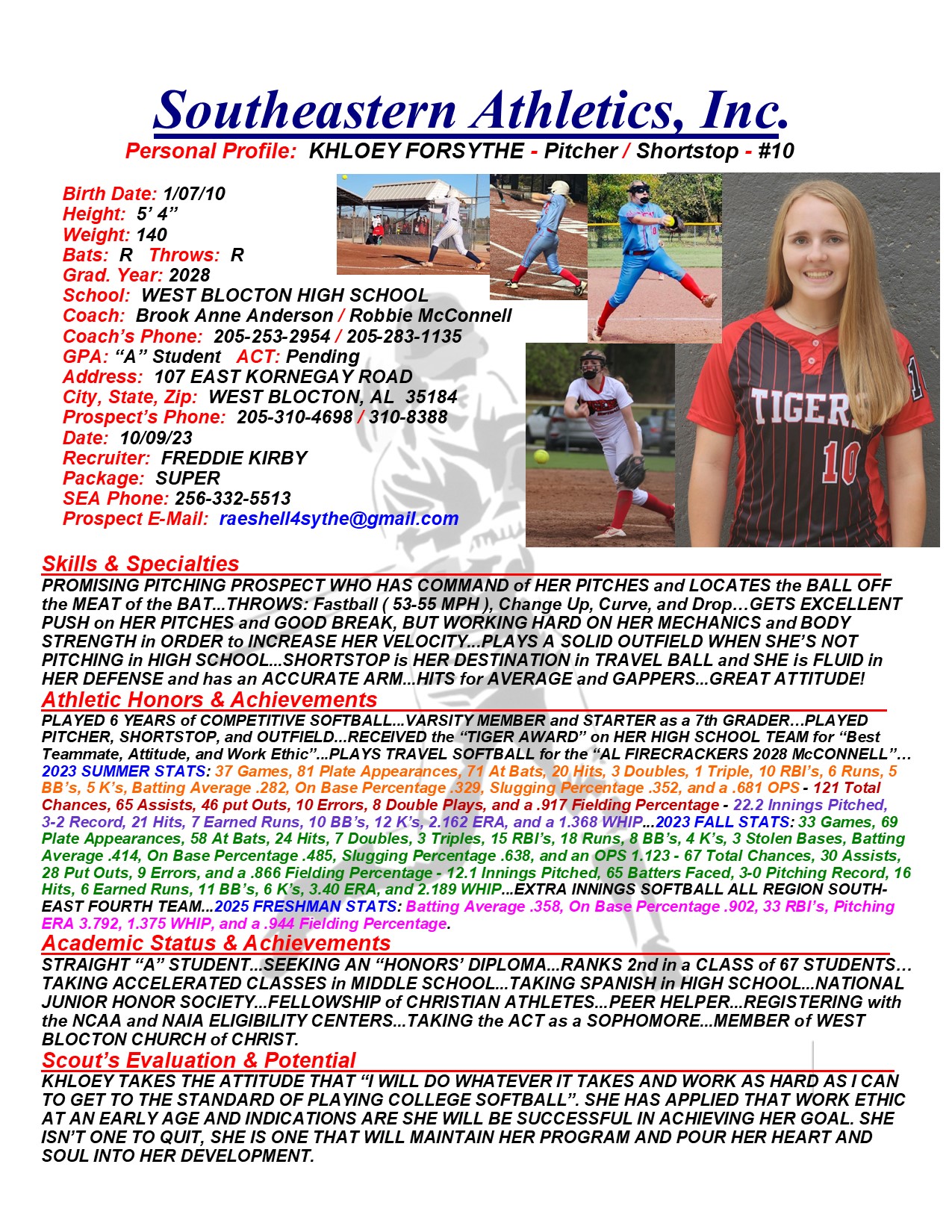 Khloey Forsythe, 2028, Pitcher / SS, West Blocton HS, AL