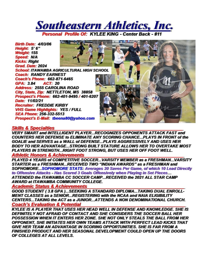 Kylee King, 2024, Center Back, Itawamba Agricultural HS, MS