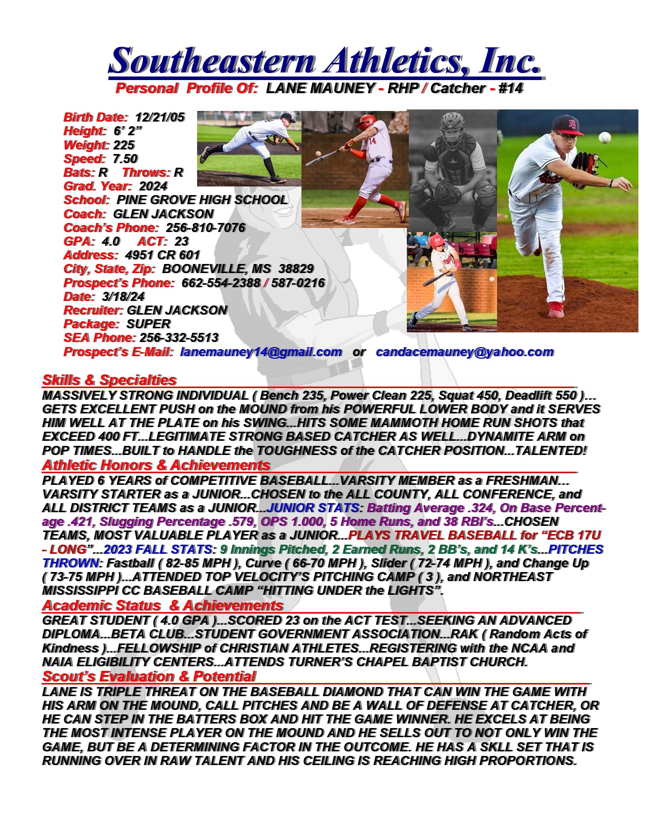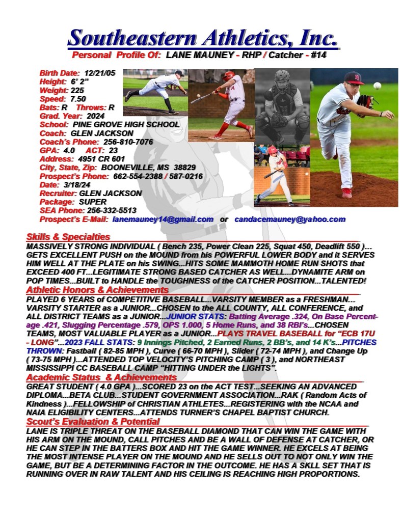 Lane Mauney, 2024, RHP / Catcher, Pine Grove HS, MS