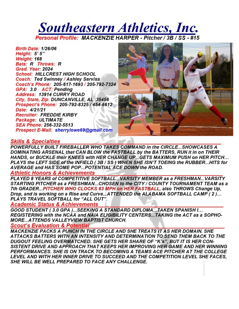 Mackenzie Harper, 2024, Pitcher / 3B / SS, Hillcrest HS, AL