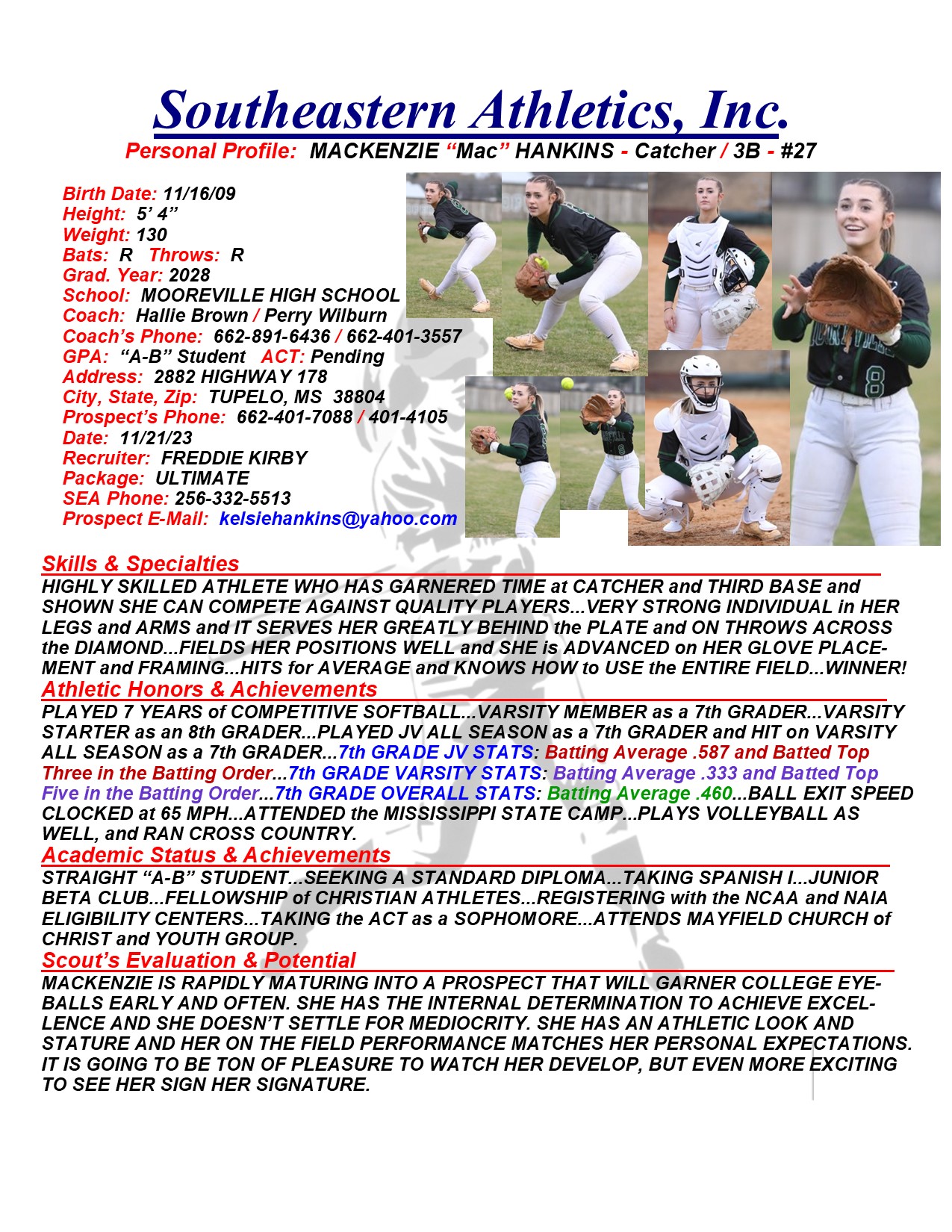 Mackenzie “Mac” Hankins, 2028, Catcher / 3B, Mooreville HS, MS