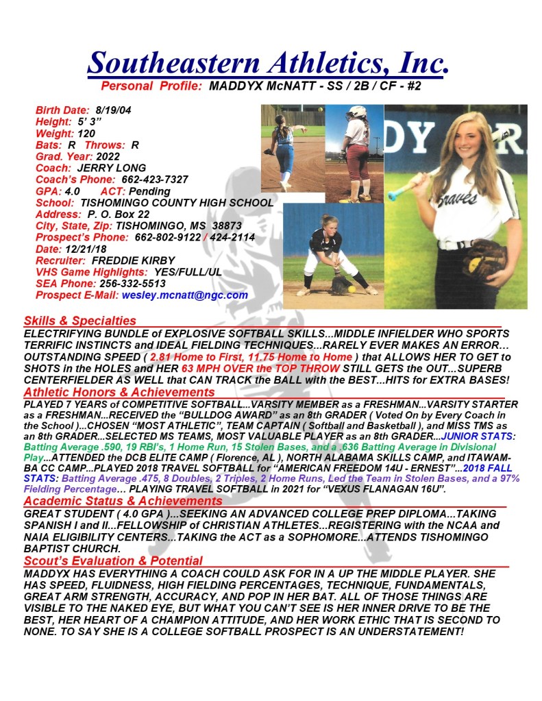 Maddyx McNatt, 2022, SS / 2B / CF, Tishomingo County HS, MS