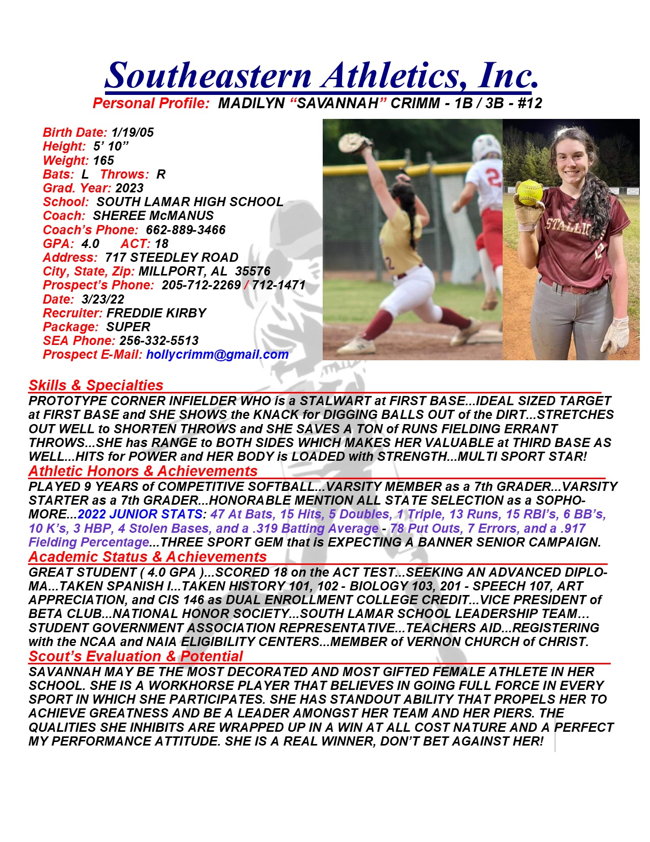 Madilyn “SAVANNAH” Crimm, 2023, 1B / 3B, South Lamar HS, AL