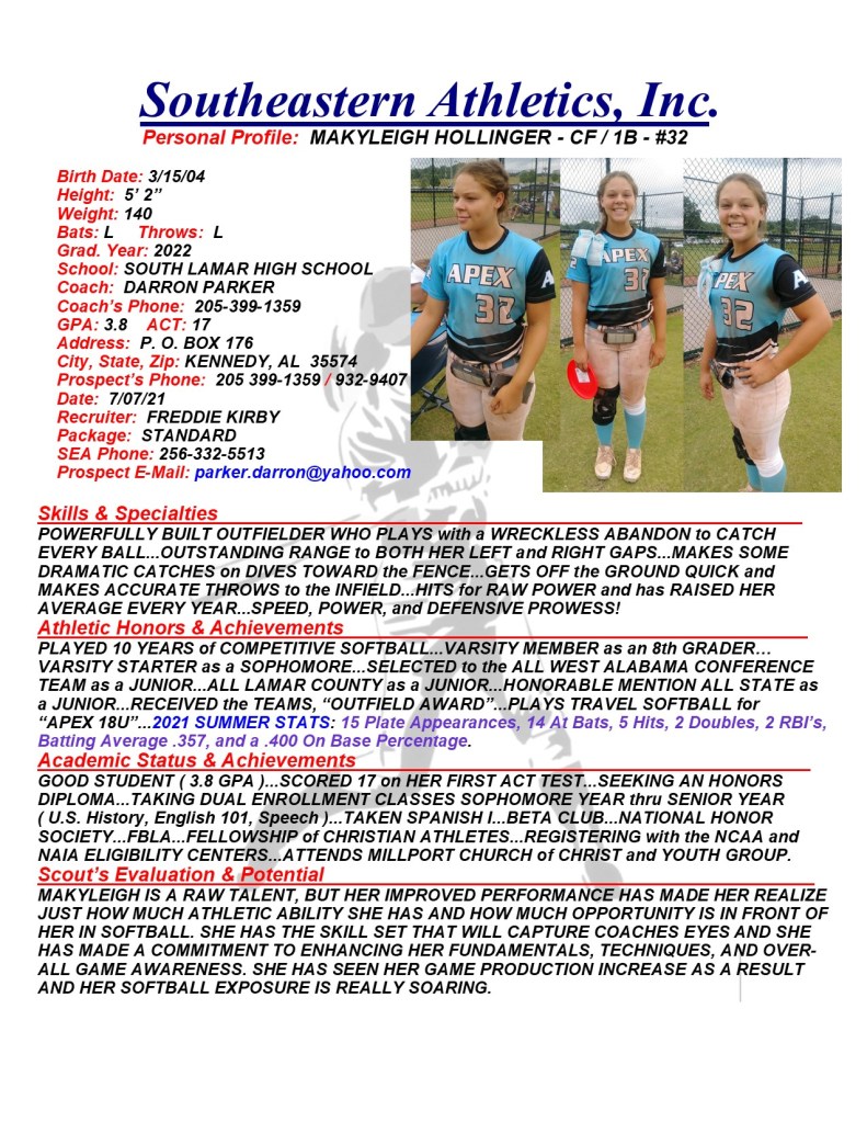Makyleigh Hollinger, 2022, CF / 1B, South Lamar HS, AL