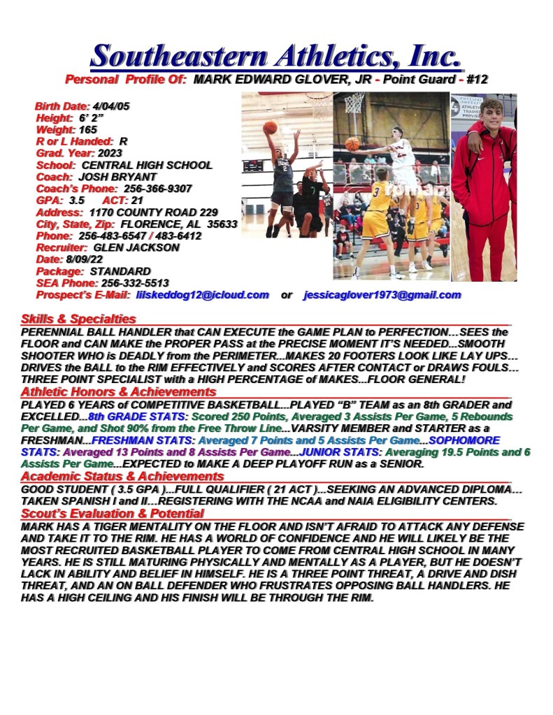 Mark Glover, Jr, 2023, Point Guard, Central Florence HS, AL