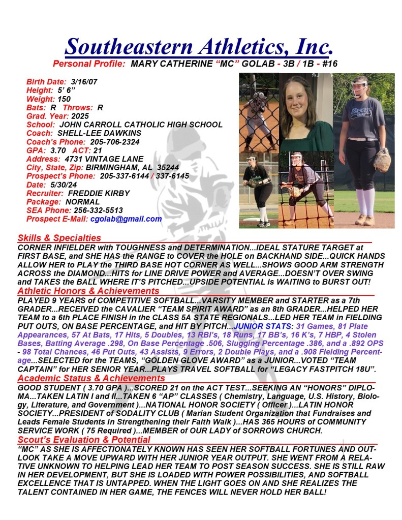 Mary Catherine “MC” Golab, 2025, 3B / 1B, John Carroll Catholic HS, AL