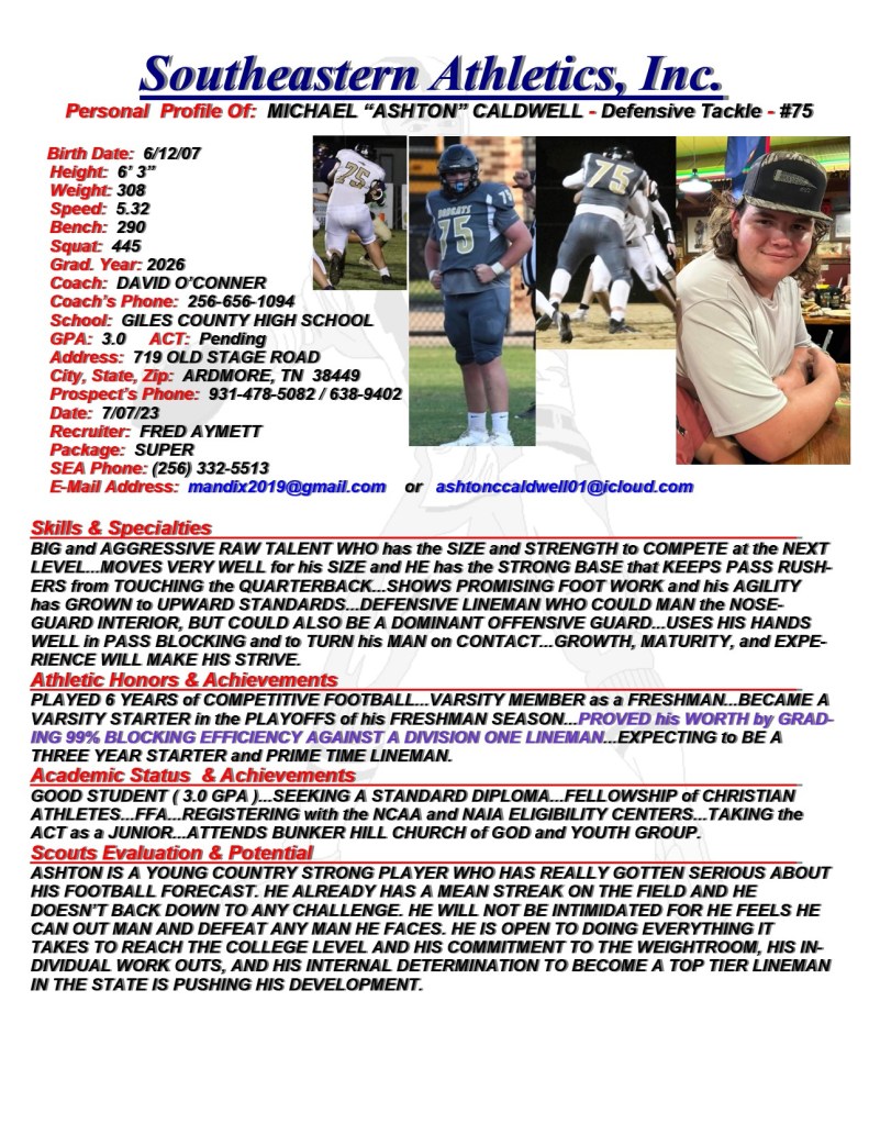 Michael “Ashton” Caldwell, 2026, Defensive Line / OG, Giles County HS, TN