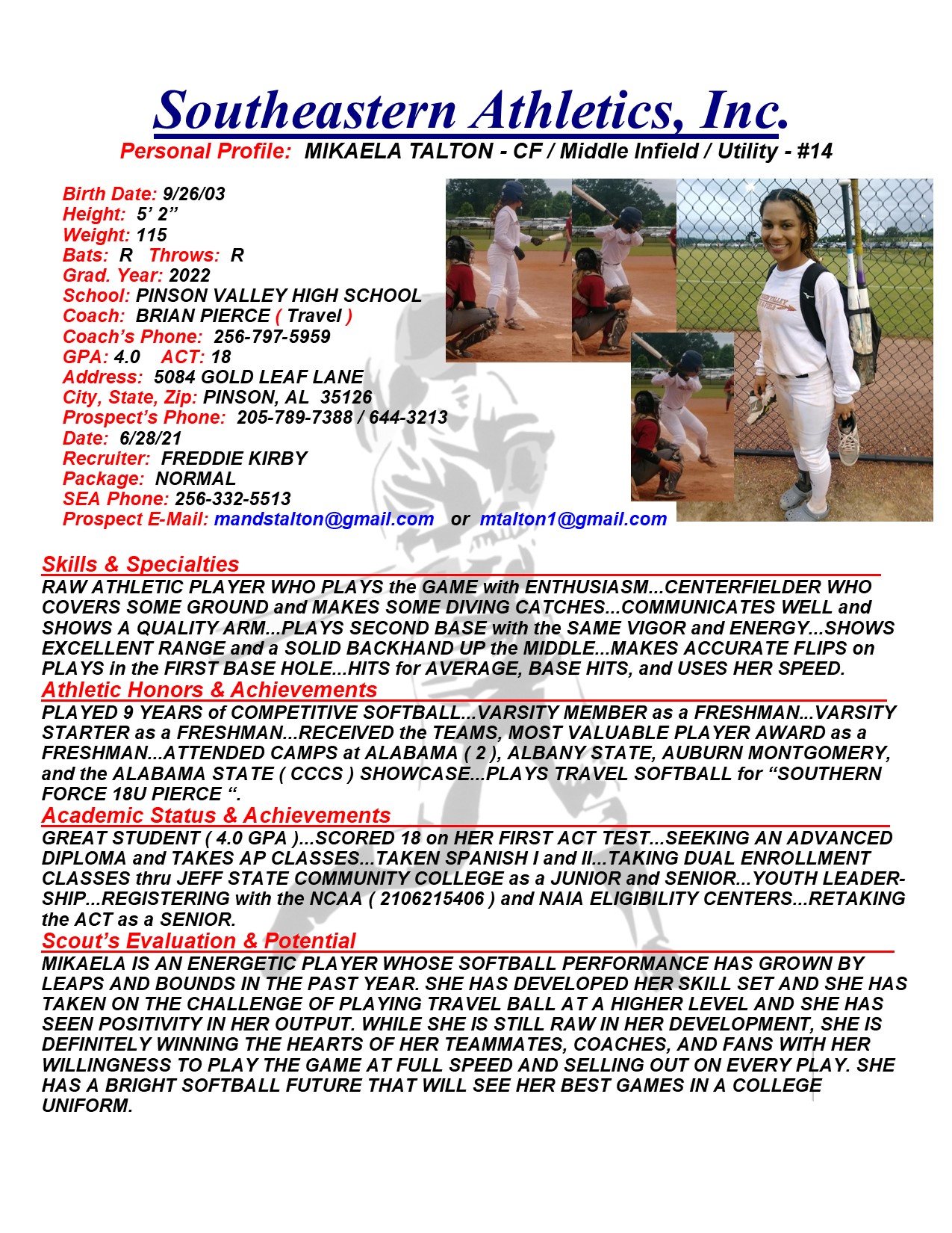 Mikaela Talton, 2022, CF/ Middle Infield / Utility, Pinson Valley HS, AL