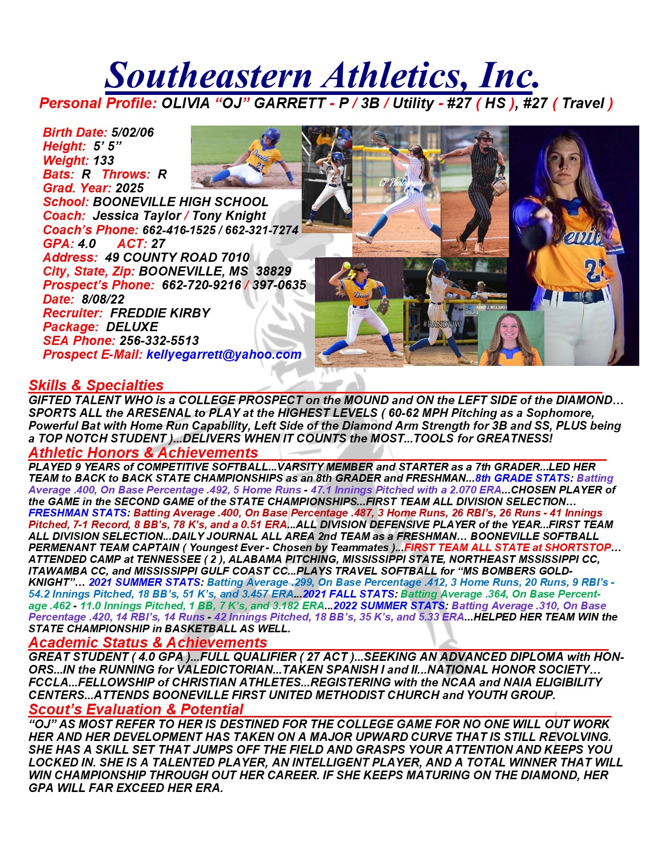 Olivia “OJ” Garrett, 2025, Pitcher / 3B / SS, Booneville HS, MS