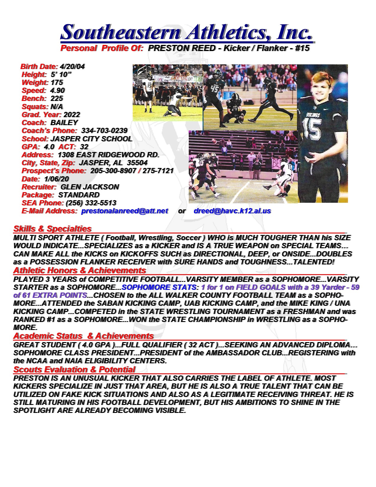 Preston Reed, 2022, Kicker / Flanker, Jasper City School, AL