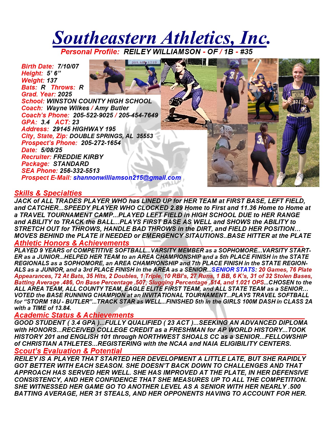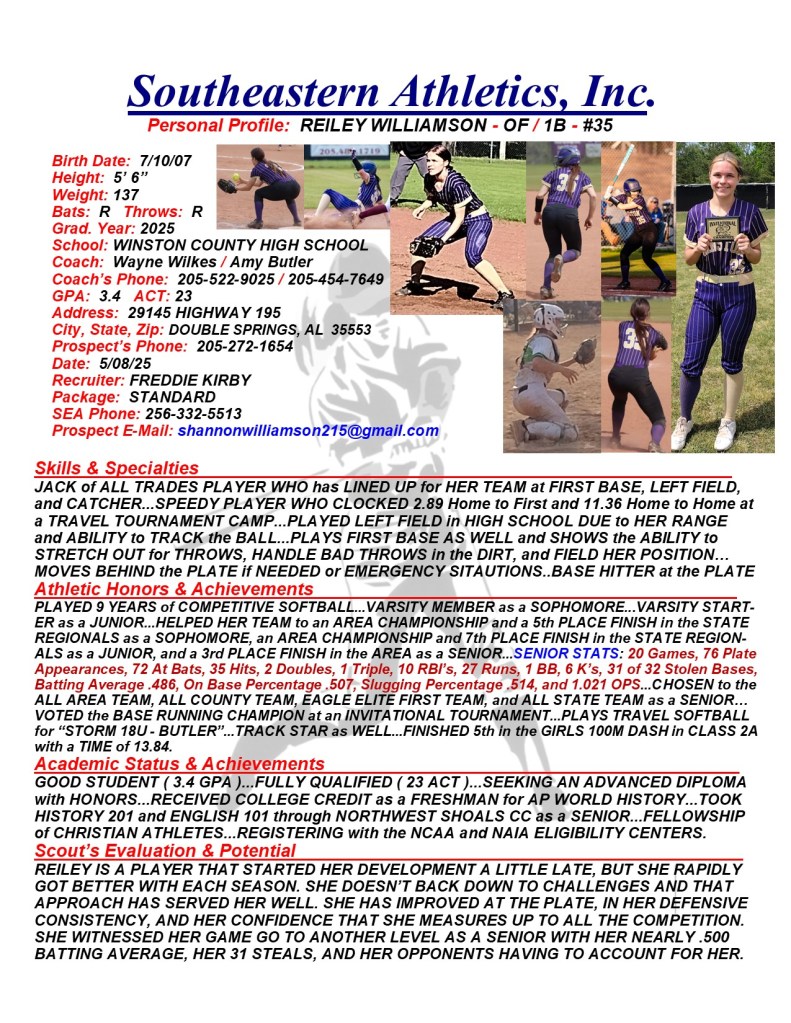 Reiley Williamson, 2025, OF / 1B / Catcher, Winston County HS, AL