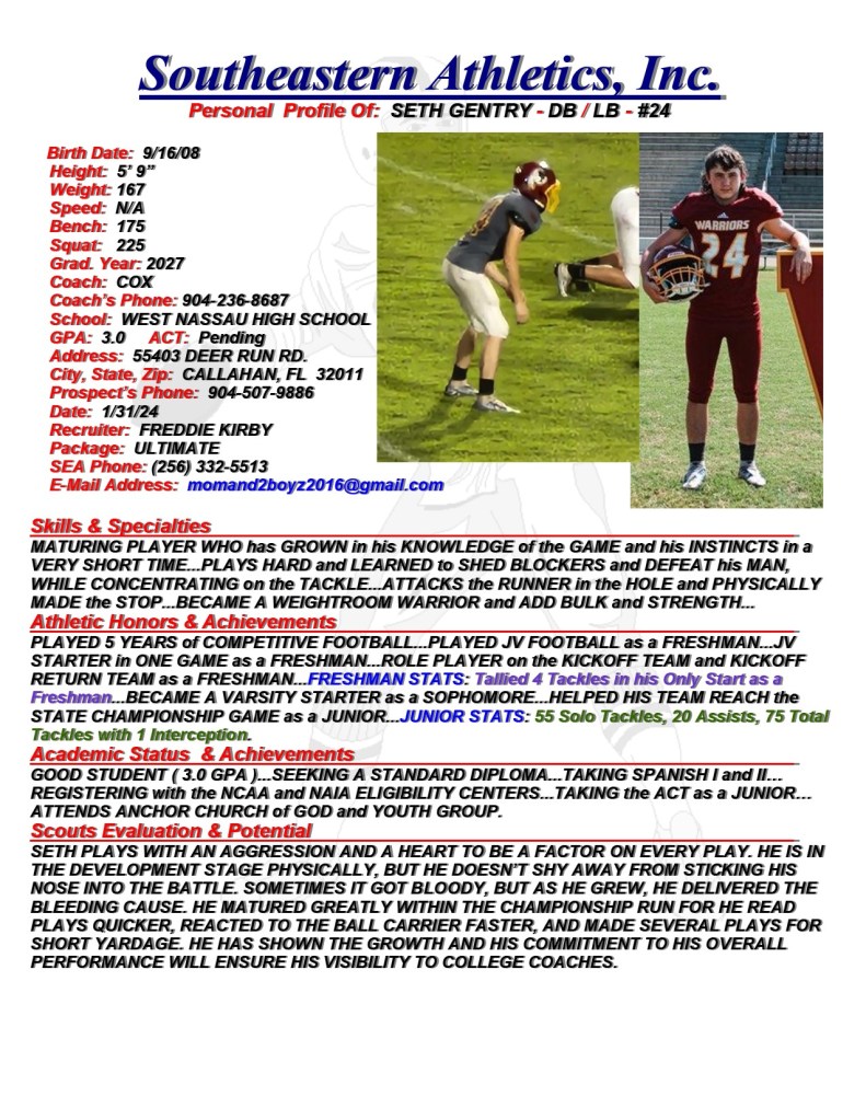 Seth Gentry, 2027, DB / LB, West Nassau HS, FL