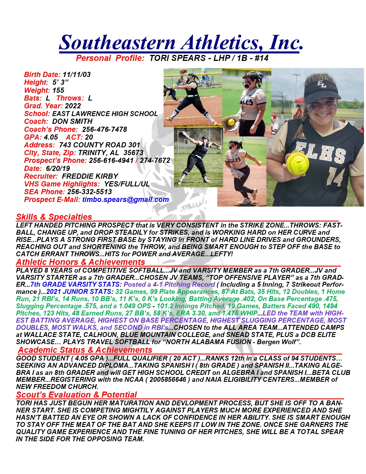 Tori Spears, 2022, LHP / 1B, East Lawrence HS, AL