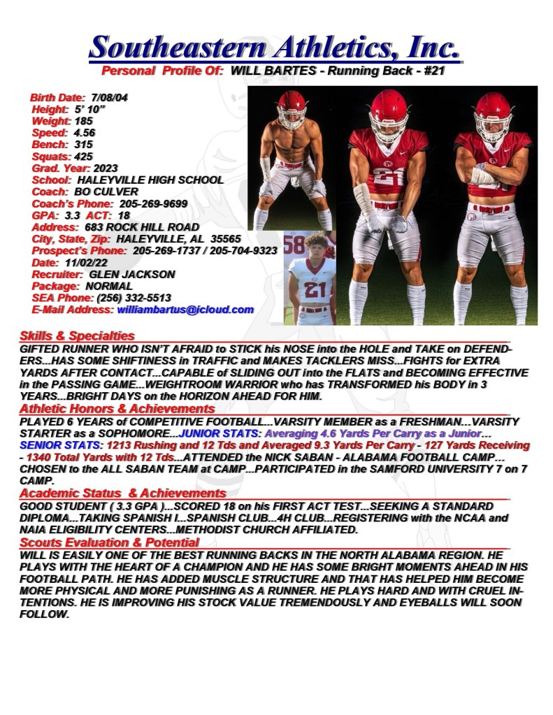 Will Bartes, 2023, Running Back, Haleyville HS, AL