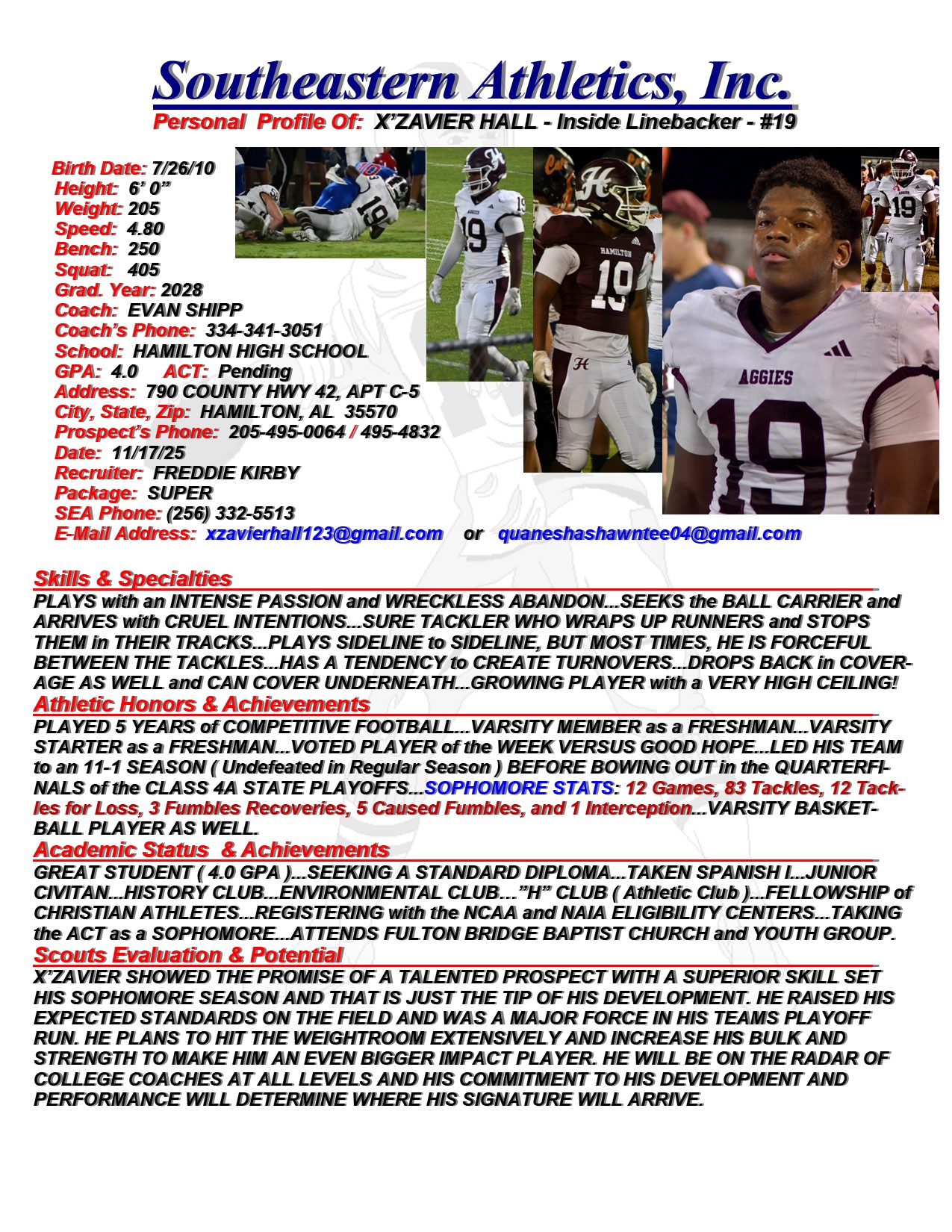 X’Zavier Hall, 2028, Inside Linebacker, Hamilton HS, AL
